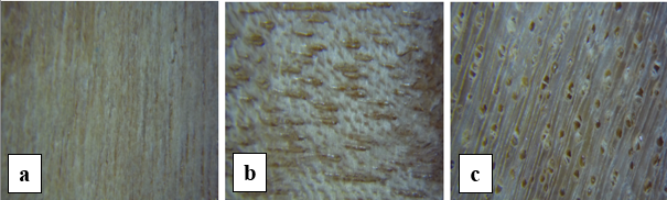 Fotomacrografia da madeira Trattinickia sp. – a) secção tangencial, b) secção radial, c) secção transversal. Fonte: autor.