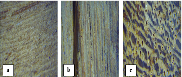 Fotomacrografia da madeira Hymenolobium petraeum. a) secção tangencial, b) secção radial, c) secção transversal. Fonte: autor.