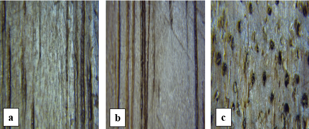 Fotomacrografia da madeira de Anacardium spp. – a) secção tangencial, b) secção radial, c) secção transversal. Fonte: autor.