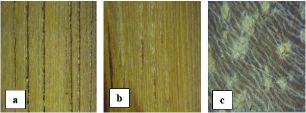 Fotomacrografia da madeira de Parinari Aubl – a) secção tangencial, b) secção radial, c) secção transversal.
