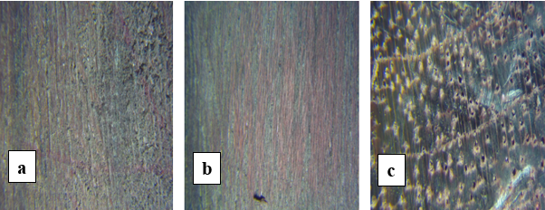 Fotomacrografia da madeira de Peltogyne sp. – a) secção tangencial, b) secção radial, c) secção transversal. Fonte: autor.